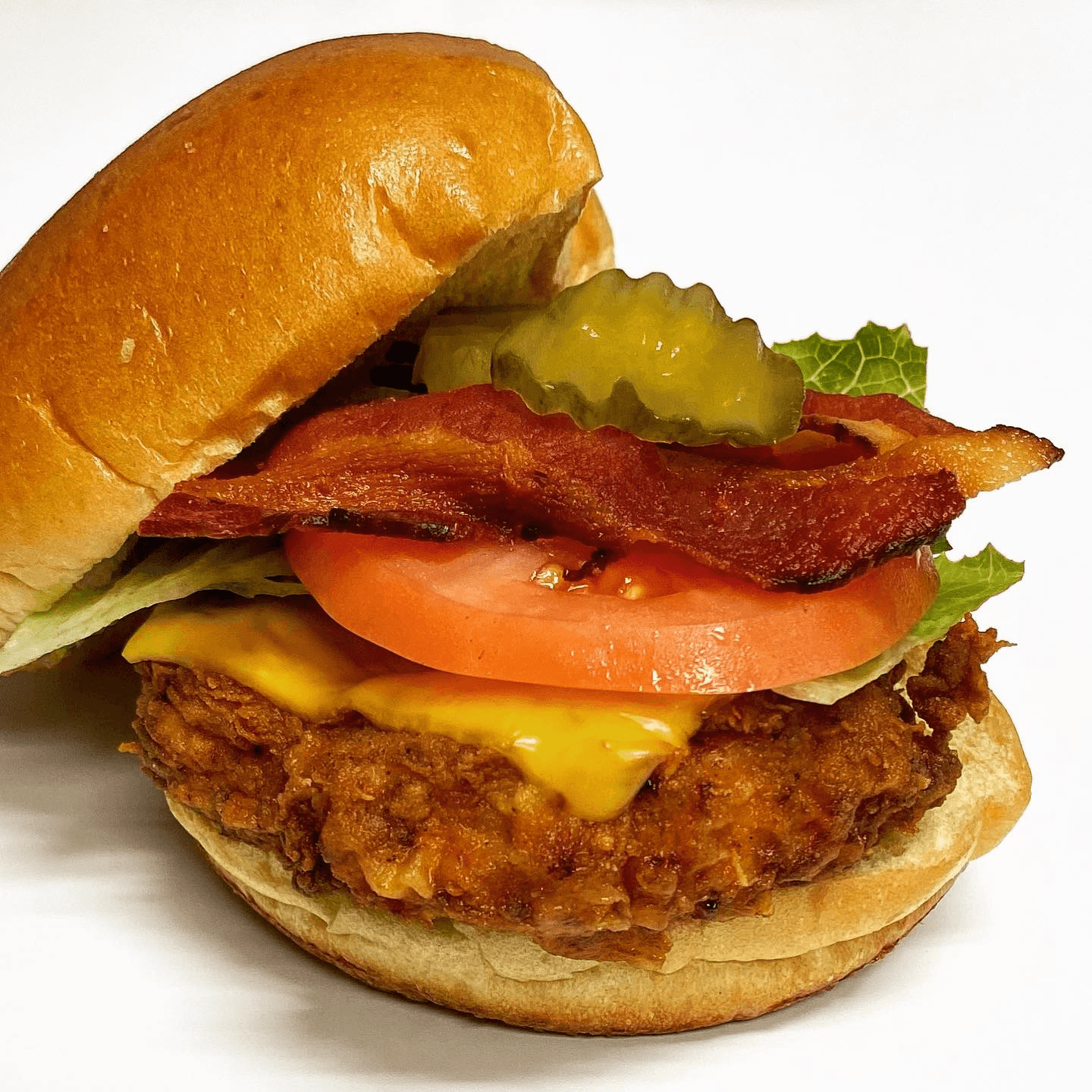 Fried chicken breast, topped with American cheese, bacon, lettuce, tomato and pickle chips on a toasted brioche bun. Have it plain or tossed in any FWF sauce.