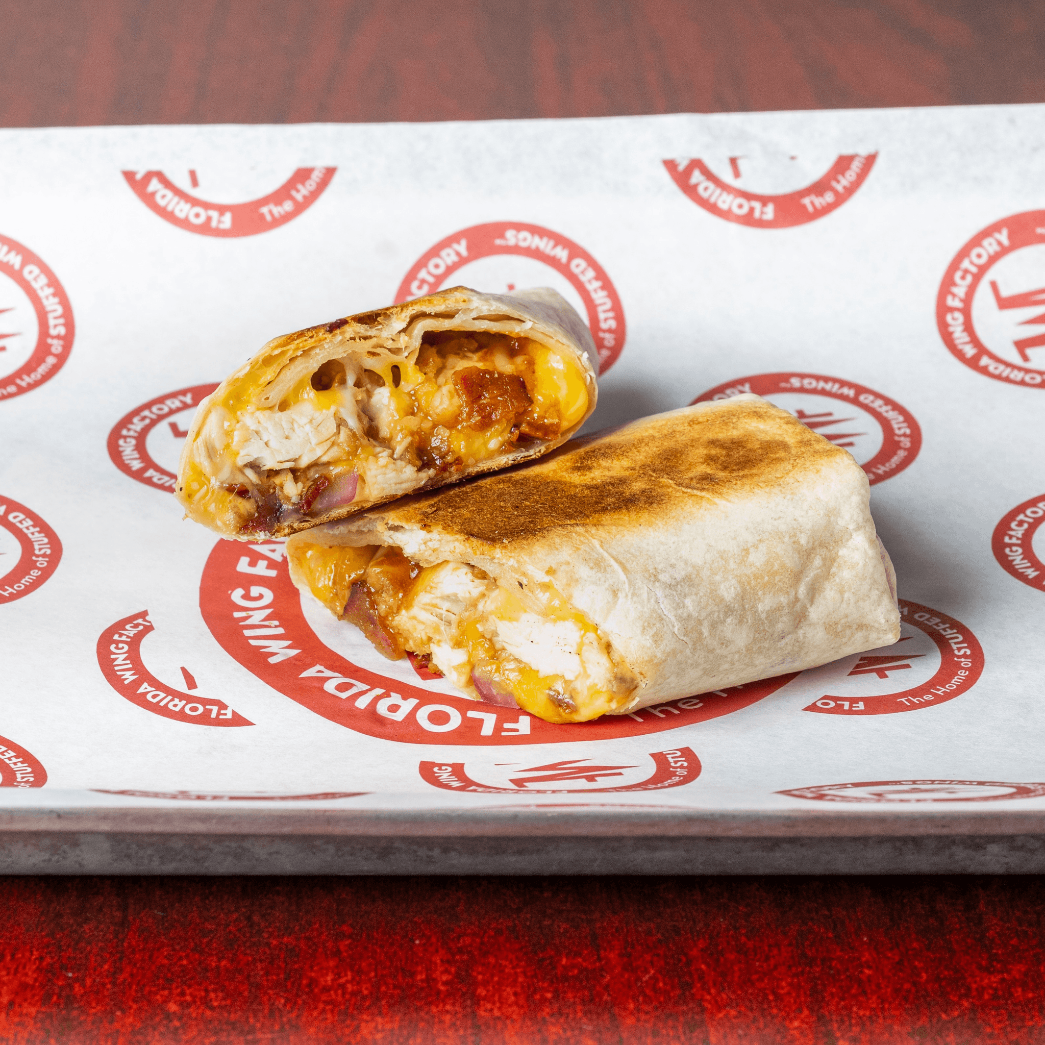 Flour tortilla filled with cheddar jack cheese, bacon bits, grilled or fried chicken and choice of sauce. Served with choice of house ranch, blue cheese or sour cream. Includes drink and one side.