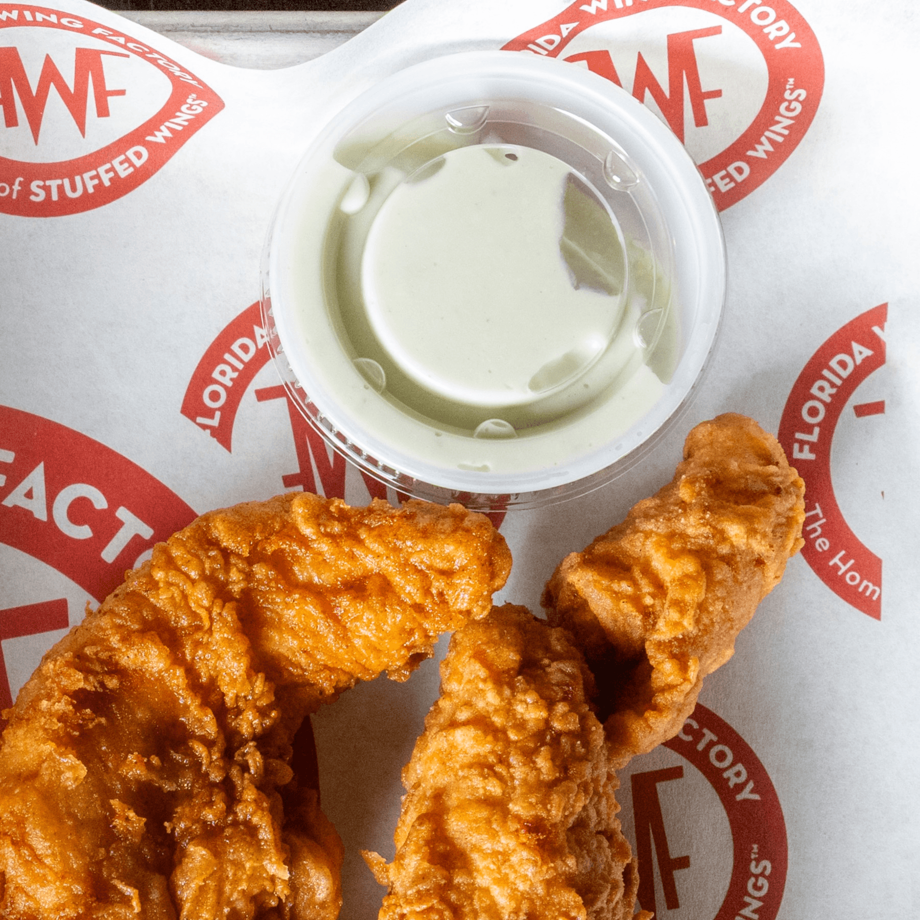 Jumbo tenders, hand-breaded and fried. Comes plain or tossed in your favorite FWF sauce. Served with house ranch or blue cheese dressing (6 pieces).